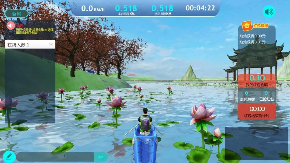 微风轻吹,河面荡起层层波澜,兴尽晚回舟,误入藕花深处,智能划船器体验真实划船感受,转弯、速度自我把握,数据实时显示,还可与运动玩家一起抢红包、分享运动感受!