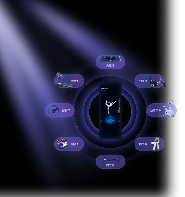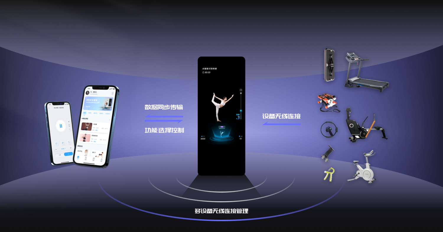 利用自主研发的健焰Al体感健身魔镜作为中枢设备,连接众多健身器材,将课程、场景、数据、游戏整合到魔镜当中,真正形成一套完整的家庭智能健身中心系统。